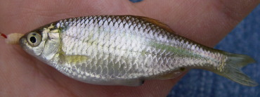 手首を素早く返して跳ね上げ、手元まで飛ばしてきた5cm半ほどの銀色の魚。その肩口には小斑、体の後半部には青緑色の縦帯が入り、尻鰭前方からは産卵管が長々と伸びています。