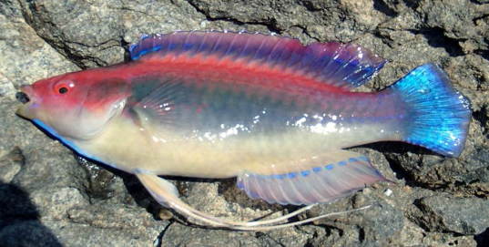 正体はイトヒキベラという小型のベラでした。それも婚姻色のオスのようです。これは美しい!カッコイイ!嬉しい!わずか8cmほどの魚ですが、この1尾を手にできただけでここまで走ってきた意味があったというものです。