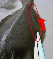 → | ![]() 〜作業の概要〜 切り口を手前にして、 右側の辺 (ヒラメの場、腹側に当たる) のヒレと身のつなぎ目ギリギリを 切り離します。 |